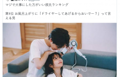什么样的男人是可以交往的对象? twitter帐户「监视ポリス」这篇推文是这么说的:妳应该珍惜的男人排行榜冠军,就是会在妳洗完澡后说「我来帮妳吹头髮」的男人,但对此木下ひまり(木下日葵)的看法是ー