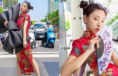 就在西門町旁的大馬路上,僅僅的幾秒鐘過馬路時間也有人能搞事!整條大街都是這位妹子「瑀彤」的伸展台,穿著艷紅的旗袍洋裝,綁起兩可淘氣可愛的包頭,十足的中國風踏走在斑馬線上,路旁等著紅燈的司機們衣眼就看呆,眼見抱著黑色誇張大啾啾的她在此擺著Pose,短短一分鐘內就喀擦走人! (