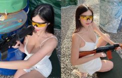 身高170公分的JKF女郎羅莉 Rolly,與生俱來一雙逆天長腿,最近她挑戰打靶,當天穿著低胸細肩帶背心,飽滿上圍呼之欲出,這造型已經夠火辣了,沒想到她舉槍打靶時,超強的後座力讓她全身狂震,胸前的白嫩奶球也跟著晃到讓人頭暈,根本就一種欺敵戰術!