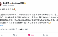 看了这篇发文就知道,蒼山愛奈 (苍山爱奈 )要引退了。文章写得很清楚,在10月5号的活动之后,蒼山愛奈(苍山爱奈)就要下台一鞠躬,社群帐号也将一并删除;她说,活动是最后一次和大家见面的机会,她想和大家多聊聊、亲口和每一位粉丝说再见⋯