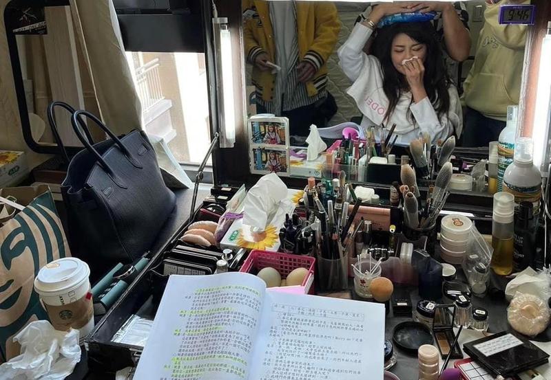 ▲王彩樺冰敷時還一邊看劇本。(翻攝王彩樺臉書)