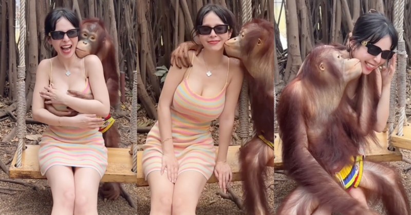 去泰國不只可以玩水,還有很多好吃好玩好逛的行程,也有許多人熱愛去的動物園,可以跟各種類型的動物們互動!除了找老虎、花豹合照,還有超會跟人類互動的紅毛猩猩陪玩~巨乳姊姊「香菱」就穿的爆乳細肩帶小洋裝,坐在鞦韆上跟猩猩互動合照,沒想到猩猩居然直接從後面抱住她,雙手還正好抓在香菱的G奶上,並且還揉捏了一下! 香菱被猩猩嚇到大笑,但也持續跟牠互動,抱著猩猩還被親吻臉頰等等~事後香菱將影片發到自己的IG上表示:「可以告嗎」,引起許多網友熱情評論:「可以加入嘛」、「牠懂玩」、「我不想當人了!」、「人家猩猩摸沒事 我們男生都輸給牠了」。