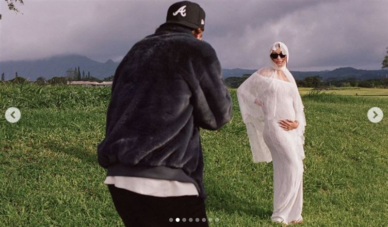 小賈斯汀與老婆海莉在社群平台上放上一段影片,只見影片中,海莉挺著孕肚身穿白色蕾絲連身長裙,和小賈斯汀深情擁吻,甜蜜之情溢於言表,畫面一旁還有牧師現身。