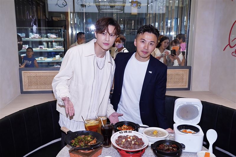▲阿緯(左)旗下餐飲品牌今舉辦開幕記者會,邀請到好友王子邱勝翊(右)站台。(圖/記者趙于瑩攝影)