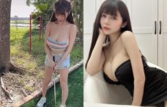 打個高爾夫球也得三顆併用嗎?眼前這位兇猛揮桿的妹子就是甜心教主「安希Anxi」,綁著公主頭、穿著細肩帶和牛仔短褲,休閒的裝扮卻依然亮眼,根本撐不太住的上衣領口被巨乳拉到最下緣,還不斷在側邊溢出濃濃的奶液,就在每次揮桿的瞬間,隨之擺動球球也跟著晃起,畫面實在震撼到不行! (
